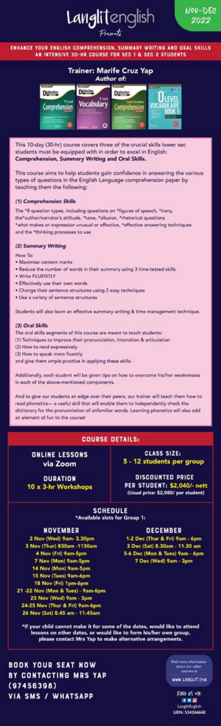 Sign your child up today for our Lower Sec Comprehension Skills Course by whatsapping Mrs Yap (97456398).